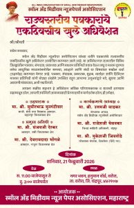 चंद्रपूर (प्रतिनिधी):- लघु व मध्यम वृत्तपत्रांच्या अस्तित्व, हक्क आणि बदलत्या माध्यमविश्वातील आव्हानांवर सखोल विचारमंथन करण्यासाठी स्मॉल अँड मिडीयम न्यूजपेपर असोसिएशन यांच्या वतीने राज्यस्तरीय पत्रकारांचे एकदिवसीय खुले अधिवेशन शनिवार, २१ फेब्रुवारी २०२६ रोजी वरोरा येथे आयोजित करण्यात आले आहे.