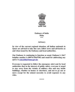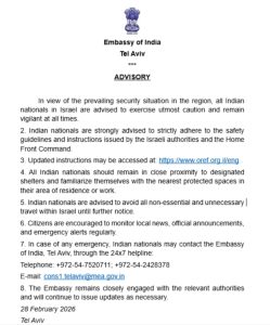 भारतीय दूतावास संबंधित देशांतील परिस्थितीवर सातत्याने लक्ष ठेवून असून वेळोवेळी अद्ययावत सूचना जारी करत आहेत. नागरिकांनी अफवांवर विश्वास न ठेवता केवळ अधिकृत माध्यमांवरूनच माहिती घ्यावी, असेही आवाहन करण्यात आले आहे.