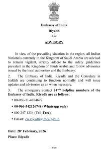 मुंबई (प्रतिनिधी) : मध्यपूर्व व परिसरातील काही देशांमध्ये निर्माण झालेल्या तणावपूर्ण प्रादेशिक परिस्थितीच्या पार्श्वभूमीवर भारत सरकारने संबंधित देशांतील भारतीय नागरिकांसाठी सुरक्षा ॲडव्हायझरी जारी केली आहे. विविध देशांतील भारतीय दूतावासांनी तेथे वास्तव्यास असलेल्या नागरिकांना सतर्क राहण्याचे, अनावश्यक प्रवास टाळण्याचे आणि स्थानिक प्रशासन व दूतावासांच्या सूचनांचे काटेकोर पालन करण्याचे आवाहन केले आहे.