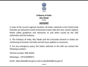 महाराष्ट्रासह देशातील जे नागरिक सध्या यूएईमध्ये आहेत किंवा काही कारणास्तव अडकले आहेत, त्यांनी दुतावासाच्या अधिकृत ‘एक्स’ (ट्विटर) खात्यावरील अपडेट्स नियमितपणे पाहावेत, असे सांगण्यात आले आहे. परिस्थितीनुसार आवश्यक सूचना व मार्गदर्शन तेथून दिले जात आहे.